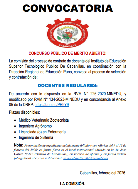 Gracias por su visita a nuestro Portal Web Institucional. En nombre de todo el personal docente, administrativo y de servicios del Instituto de Educación Superior Tecnológico Público Cabanillas, le expresamos nuestro más cordial saludo y agradecimiento.